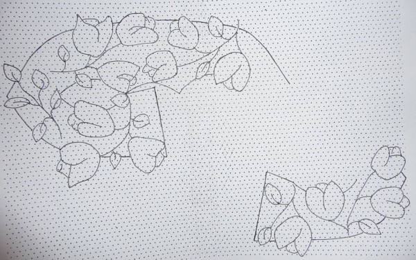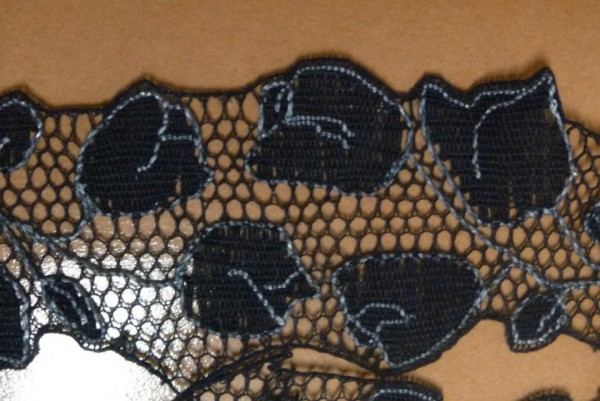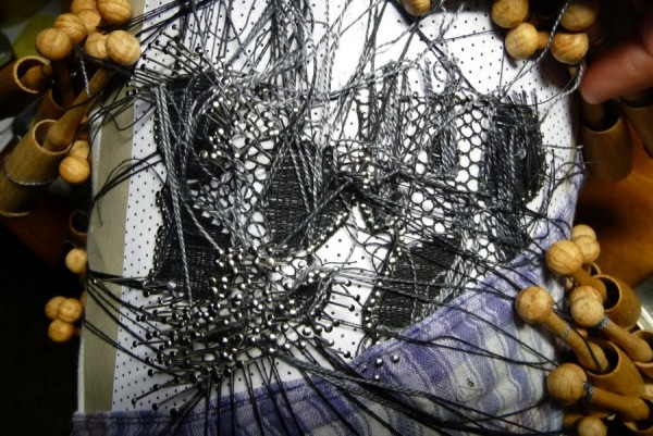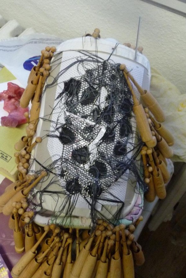 Místo klasické obtahovačky, jsem použila techniku vloženého páru, počet šedých nití se mi tak zdvojnásobil a při nutnosti stále napojovat a ukončovat další, vznikl pěkný chaos. A to byl teprve začátek.