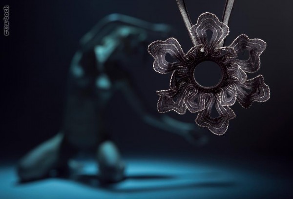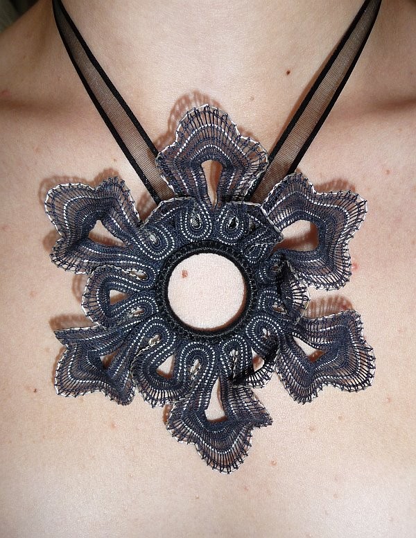 Jeden z mých šperků a další 3D záležitost, tentokrát znovu černá. Název vznikl až během jednoho focení. V podstatě i vznik tohoto šperku má svůj osobitý příběh. Někde doma v šatní skříni, kde máme nitě a vše potřebné k tvoření, jsem objevila kroužek na věšení závěsů. Téměř ihned mě napadlo ho použít do šperku. Tvar opět není můj, v krabici s podvinky jsem nalezla jedena na metrovou páskovou krajku. Motiv se mi líbil, tak jsem jej použila a vytvarovala do kruhu.