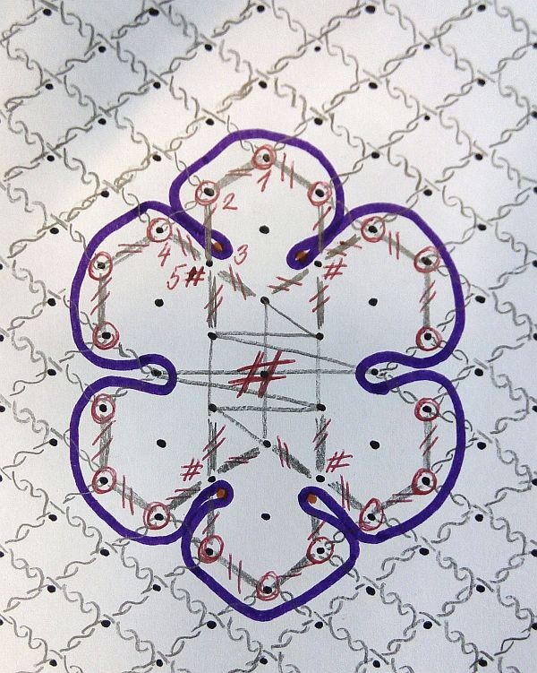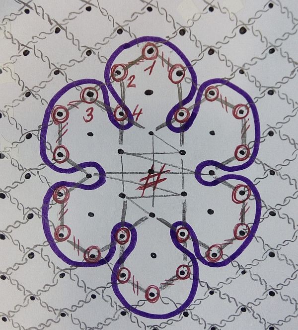 obrázek: Zde jsem částečně rozkreslila, jak se kytičky paličkují. Vláčková krajka se paličkuje v diagonálách, a abychom mohli upaličkovat další řadu, musíme mít hotovou tu předchozí. Na obrázku jsou čísly označené stěžejní body. Upaličkovat bod 1 a 2 není problém, obtahovačka si žádá upaličkování bodu 4, ale bez bodu 3 na něj nebudeme mít potřebné páry. A právě v bodě 4 musíme udělat průvlek.