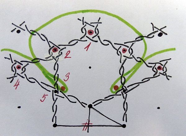 obrázek: Zde je konkrétně rozkreslený problematický úsek. Klasicky upaličkujeme body 1 a 2. Oba páry jednou zkroutíme a prohodíme jimi obtahovačku. Píchneme špendlík v bodě 3 (hnědý puntík na obrázku), vedlejší pár 1x zkroutíme, prohodíme obtahovačku a prohodíme ji i druhým párem z bodu 2. Tento pár klasicky 2x zkroutíme za obtahovačkou a můžeme upaličkovat obtáčené plátno v bodě 4. Nyní nám zbývá bod 5. Pár mířící k tomuto bodu zleva 2x zkroutíme, pár ze shora zkroutíme 1x a upaličkujeme jimi plátno, poté oba páry 2x zkroutíme a paličkujeme dále. Totéž i na druhé straně kytičky.
