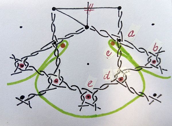 obrázek: Spodní polovina kytičky se paličkuje obdobně. Z plátna páry 2x zkroutíme, upaličkujeme plátno (bod a), pravý pár zkroutíme 2x a můžeme obtáčeným plátnem upaličkovat bod b. Páry od bodu b 1x zkroutíme, prohodíme obtahovačku, pár z bodu a nekroutíme, než prohodíme obtahovačku. Do hnědého puntíku píchneme špendlík. Vedlejší pár 1x zkroutíme, prohodíme obtahovačku a bez kroucení prohodíme obtahovačku i levým párem z bodu b. Oba páry 2x zkroutíme a upaličkujeme již klasicky doby d a e. Stejný postup opakujeme i na druhé straně.